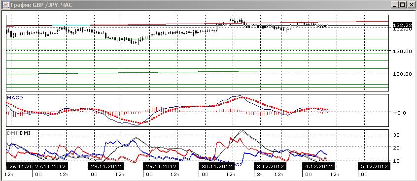 На часовом графике пара снижается, но в этом масштабе поддержкой выступает близкий уровень 132,00, который пара тестировала и в течение понедельника. По индикаторам направленного движения пара, скорее, попытается пробить этот уровень вниз: гистограмма MACD в отрицательной зоне, линия MACD направлена вниз, DM- выше DM+ при начавшемся росте ADX.