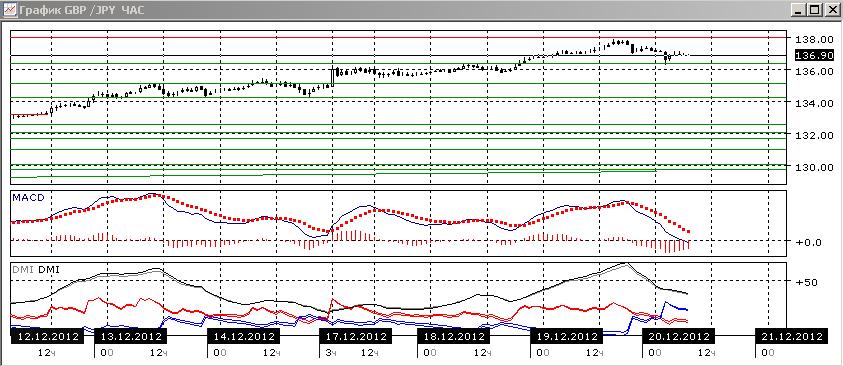 В четырехчасовом масштабе образуются предпосылки для снижения. Пара от уровня 138 снизилась до бывшего ранее сопротивлением 136,40. Линия MACD направлена теперь вниз, снижается гистограмма MACD. DM+ и DM- сблизились, что показывает возможность перехода к снижению и по ADX. Пока, однако, скорее стоит подождать преодоления вниз уровня 136,40 — тогда снижение уже не будет выглядеть небольшой по размеру коррекцией.