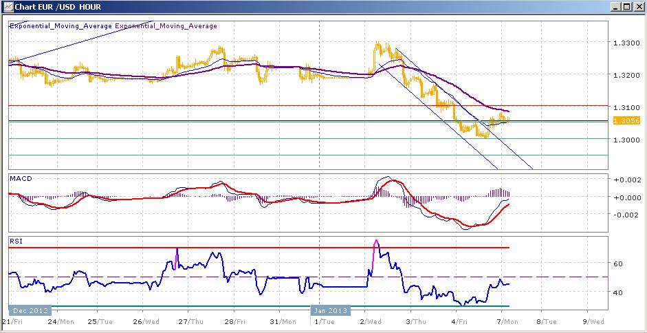 Начавшееся с начала года снижение пары приостановилось. В пятницу паре так и не удалось преодолеть поддержку на уровне 1.3000, торги в пятницу завершились слабым ростом пары, закрепившейся выше 1.3050. сегодняшние торги проходят с небольшим снижением, пара все также получает поддержку от 1.3050. Средние скользящие ЕМА21и ЕМА55 направлены вниз, но начинают замедляться. Индикаторы MACD и RSI с четверга находятся ниже своих центральных линий и сегодня растут. На сегодня цели вверх — 1.3100. Цели вниз на сегодня — 1.3050, 1.3000
