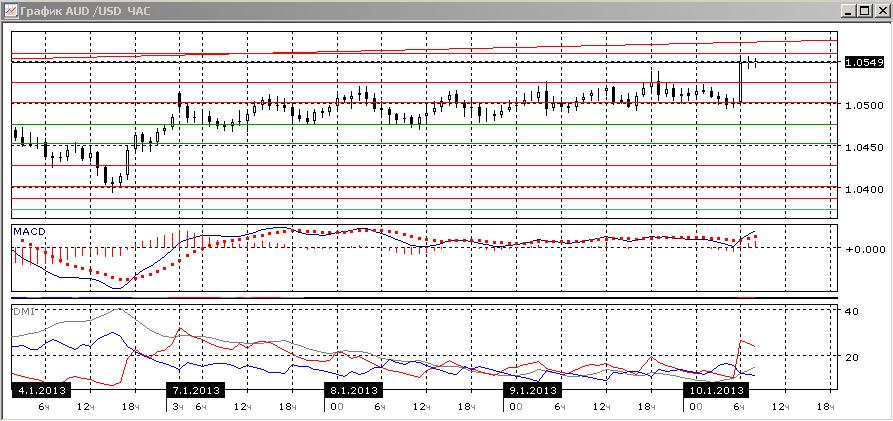 На четырехчасовом графике немного более предпочтителен рост, так как пара пробила вверх уровень сопротивления 1,0500 в вышла из канала вверх. По индикаторам направленного движения рост предпочтителен, так DM+ увеличивает превышение над DM-.