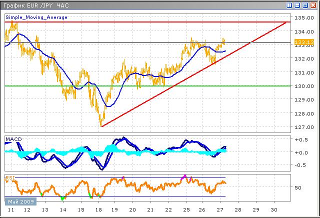 После формирования разворотной фигуры перевернутая голова плечи, с пиком 18 мая, пара завершила нисходящий тренд. Разворот оказался достаточно активным, однако развитие бычьего тренда протекает достаточно вяло. С учетом глобальных тенденций, широко ожидается рост пары в среднесрочной перспективе, поскольку до сего момента, покупатели, имея достаточно сил, не проявили себя. В настоящий момент активность медведей выросла, целью краткосрочного снижения может стать уровень 132.00. Индикаторы сигнализируют о вероятном снижении, динамика моментума, который иллюстрирован индикаторами на графике, согласуется с ценовым графиком, что говорит об отсутствии необоснованных ценовых бросков, напротив, цена представляет собой действительный баланс. На часовом графике осциллятор MACD демонстрирует медвежьи настроения, гистограмма подает сигнал на продажу, пересекая скользящие средние индикатора. RSI теряет темпы роста, замедляясь вблизи верхней границы области перекупленности.