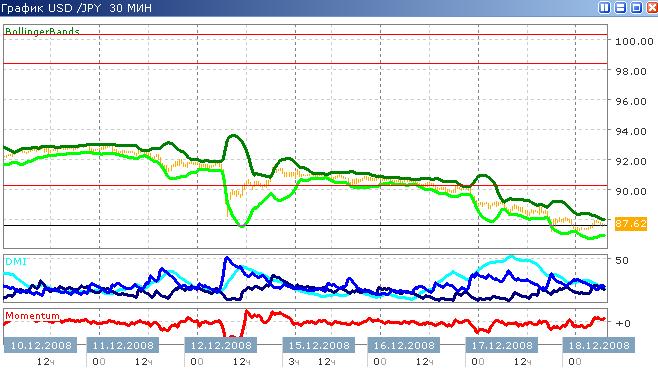 Пара показывает переменное движение, имеются как внутридневной максимум, так и минимум: максимум достигнут около 5 часов на уровне 87.9100, минимум - около 1 часа на уровне 87.1700. Таким образом, доллар торгуется против йены внутри диапазона от 87.00 до 88.00. На данном этапе тренд слабый нисходящий, значения индикатора ADX лежат ниже 18, и в краткосрочном периоде падение цены преобладает над ростом. Скорость изменения цены заметно превышает скорость других пар: индикатор момента показывает +0.25.