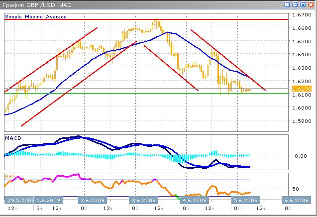 Резкое снижение задержалось у отметки 1.6100, после чего началось развитие тренда в боковом направлении. Наиболее вероятно, что откат завершился, судя по сигналам технических индикаторов. Коррекционное движение составило 76.4% от предыдущего роста, достаточно вялые торги в начале сегодняшнего дня также могут послужить сигналом к развороту, характеризуя переход инициативы к стороне покупателей. Математические индикаторы также указывают на завершение нисходящего тренда, гистограмма MACD пересекает снизу вверх нулевую линию, что является достаточным сигналом к отказу от дальнейших продаж. График индикатора RSI приблизившись к нижней границе области перепроданности развернулся и направился к уровню 50%, при этом, с учетом того факта, что стандартный RSI незначительно отстает от стандартного MACD, данный сигнал также можно считать отработанным. Очевидно, что данный момент является выгодным для занятия длинной позиции, с первой целью 1.6300, и следующей за ней 1.6660