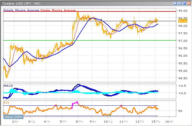 иены против доллара. Цена не преодолела уровень сопротивления 98.50, который