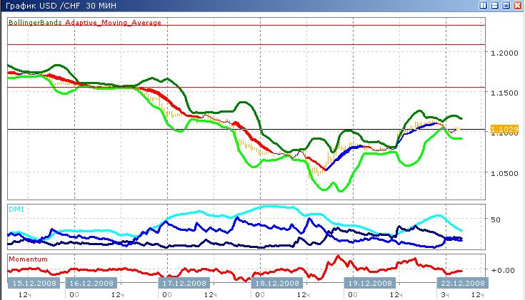 Рост доллара против франка в конце прошлой недели логически завершился минимумом сегодня в районе 5 часов утра, и сейчас курс медленно растёт. Минимум достигнут на уровне 1.0981, как раз когда usd пересёк эту отметку и начал расти, пересечение индикаторов DI+/DI- дало сигнал кпокупке. Что касается положения на данный момент, то движение вверх пока что пересиливаетдвижение вниз, однако тренд слабый (ADX меньше 20 и падает, как видно на графике) и может измениться в любой момент. Скорость роста цены по индикатору момента ниже, чем скорость падения, которая составляет приблизительно -0.07, а около 4 утра этот индикатор также сигнализировал о хорошей ситуации для покупки доллара за швейцарские франки.