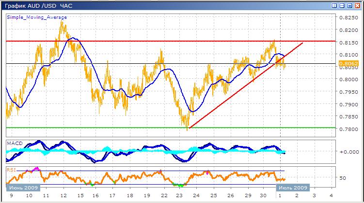 Встретившись с локальным уровнем сопротивления 0.8175, цена упала к уровню поддержки 0.8050, после чего ожидается медленное восхождение. В среднесрочной перспективе, пара преодолеет уровень сопротивления 0.8175, и вернется к максимумам, взятым 11 июня. Технические индикаторы сигнализируют о возобновлении позитивной тенденции, осциллятор