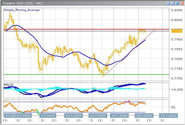 Встретившись с локальным уровнем сопротивления 0.7950, и протестировав его, цена медленно снизилась, и продолжила колебаться в узком боковом канале. Ожидается, что в краткосрочной перспективе пара преодолеет уровень сопротивления, и вернется к максимумам, взятым в начале этого месяца. Технические индикаторы сигнализируют о слабых перспективах пары сегодня, осциллятор MACD указывает на падение интереса к валюте у покупателей, продавцы в свою очередь также опасаются выходить на рынок. В то время как RSI, также информирует участников торгов о том, что быки медленно сдают позиции. В данной ситуации рекомендуется дождаться четкого сигнала пробоя локального уровня, после чего занять длинную позицию.