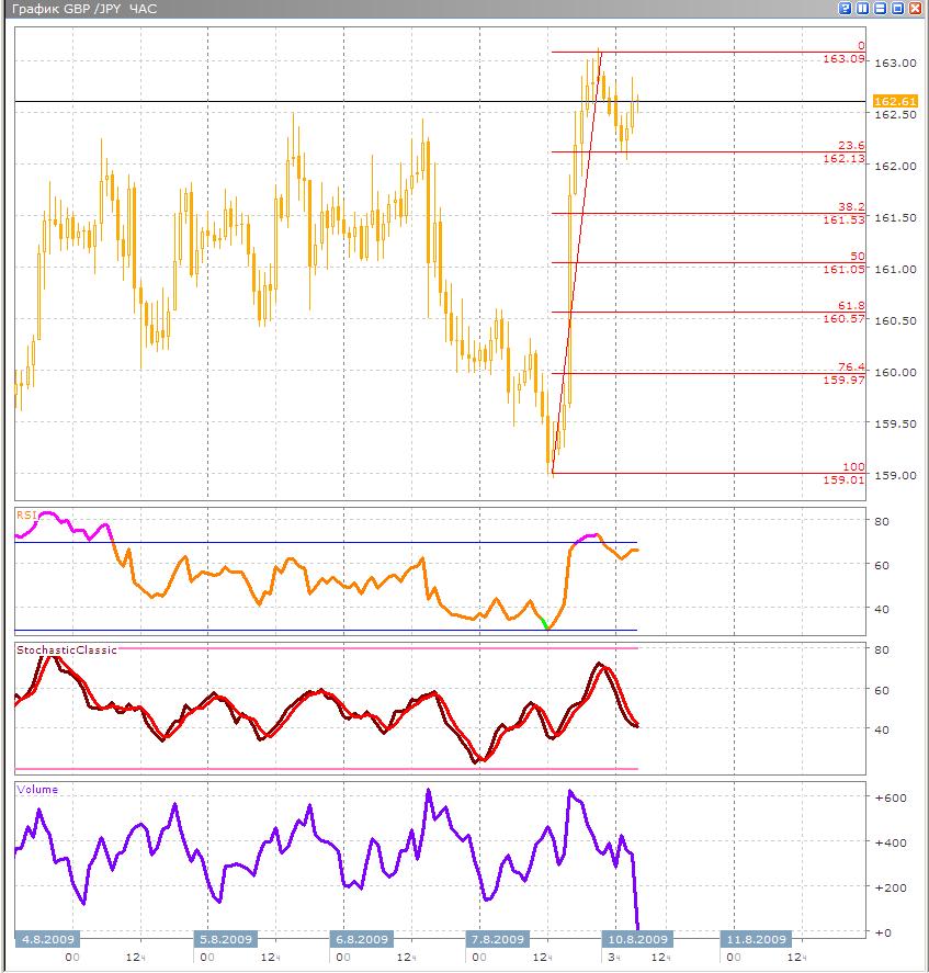 Данная валютная пара, как всегда торгуется волатильно в связи с выходом новостей по Японской экономике. Согласно анализа Фибоначчи после сильного рывка вверх произошел отскок на 23%(162.13) от движения, а потом снова вверх, но это движение не стабильно и будет иссякать, тем более выходят положительные данные по экономике Японии, что означает, что курс йены будет укрепляться по отношению к другим валютным парам. Сейчас скорее всего данный кросс-курс отработает точку в 38%(161.53) и после будет небольшой отскок вверх и движение продолжится вниз но 61.8%(160.57) по Фибоначчи. Все эти указанные точки рано или поздно будут этой валютной парой отработаны.