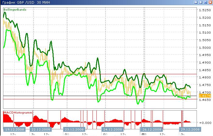 После недели волатильного и в общем нисходящего движения, похоже, что пара достигла консолидации на уровне 1.4693 и теперь движение происходит внутри коридора, ограниченного снизу поддержкой на уровне многомесячного минимума 1.4650, а сверху уровнем 1.4820. Линии Боллинжера(как впрочем и другие индикаторы) не могут дать четкого прогноза поведения графика в дневном масштабе, но, судя по виду графика, можно предположить постепенно замедляющееся падение, асимптотически стремящееся к уровню поддержки.