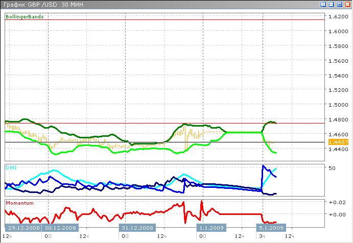 На графике фунт падает против доллара, что неудивительно, учитывая рост последнего. Пока что наблюдаются колебания вблизи уровня поддержки (1.4405), однако, не исключено дальнейшее падение: индикатор среднего направленного движения показывает сильный нисходящий тренд, находясь выше отметки 40. DI-, однако, как видно, снижается, и сейчас находится вблизи 37. Скорость падения: что-то около 0.015, по индикатору момента.