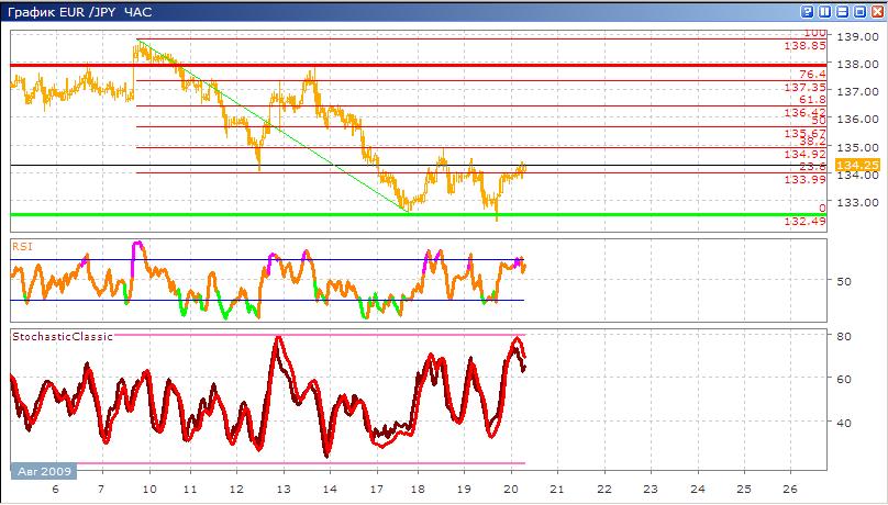 Сейчас валюта после отскока от уровня поддержки направилась вверх к уровню 38.2% по Фибоначчи, который она определенно достигнет в ближайшем будущем, это может произойти как после возврата к поддержки, так и сразу. Для этого обращаем внимание на другие классические индикаторы Stohastic нам показывает что движение будет вниз, нечто похожее показывает и RSI, но это не совсем ясно видно, поэтому я бы подождал определения более точного разворота вниз, тогда начинал бы торговлю.