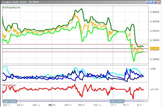 Продолжая вчерашнее падение, евро пробивает уровень поддержки и торгуется уже в окрестности многонедельного минимума, вблизи уровня 1.3611. Самый высокий уровень на сегодня 1.3664, новой линией поддержки пока что можно считать указанную отметку 1.3611. тренд сейчас слабый, показания индикатора средненаправленного движения около 20, пересечение DI+/DI- даёт сигнал на покупку. Индикатор момента показывает малую скорость изменения цен (почти 0,00).