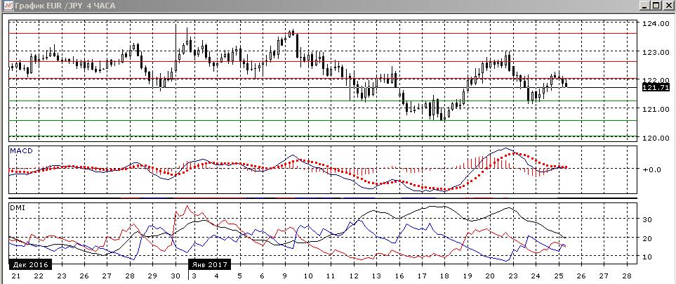 На дневном графике пара остаётся ниже нижней границы предыдущего канала 122,00, но выше уровня поддержки на 121,25. Возвращение пары ниже границы канала и образование ранее разворотной свечной комбинации с «падающей звездой» 20 января делает снижение пары предпочтительным. Снижение от 122,65 соответствует картине коррекционного движения от 120,50 ранее. По индикаторам направленного движения ситуация нейтральная: DM- и DM+ как во флэте, со снижением ADX, гистограмма MACD растёт, при отрицательном наклоне линии MACD.