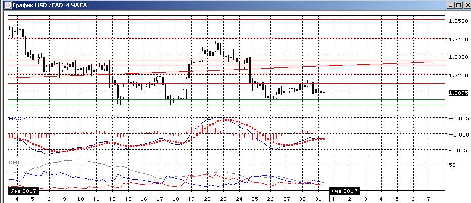 Отскок пары от 1,3060 был кратковременным и пара снижается от уровня сопротивления на 1,3150. Так как коррекционное движение, кажется, завершается, ближайшей целью видится уровень 1,3060 — исходная точка отскока, и далее уровень 1,3030, где была поддержка 19 октября, 12 и 17 января. По индикаторам направленного движения тенденция снижения сохраняется — по ADX превышение DM- над DM+ большое и устойчивое, ADX на высоком уровне. Гистограмма MACD остаётся в отрицательной зоне, но около 1,3030 образуется бычье расхождение минимумов пары и гистограммы MACD, что укрепляет поддержку и увеличивает вероятность нового отскока от 1,3030 вверх.
