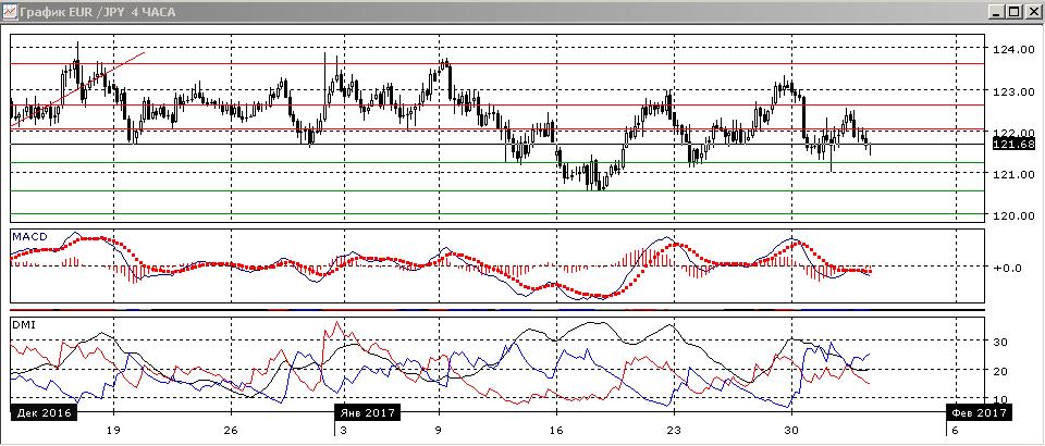 На четырёхчасовом графике скорее боковое движение: сильный уровень поддержки на 121,25 не преодолён, с 17 января минимумы растут, но с 9 снижаются. Исходя из текущего диапазона между 120,50 и 123,60, центр колебаний около 122,00. По индикаторам направленного движения в этом масштабе флэт.