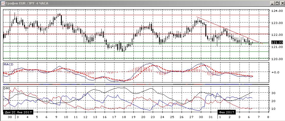 На четырёхчасовом графике образовался треугольник, образованный краткосрочной линией тренда с 27 января и уровнем 121,25. Так как треугольник направлен вниз, скорее туда будет выход, но стоит дождаться закрепления ниже 121,25, так как ранее пара отскакивала от этого уровня начиная с 12 января. По ADX пера перешла к снижение: DM- значительно выше DM+, ADX находится на относительно высоком уровне и растёт.