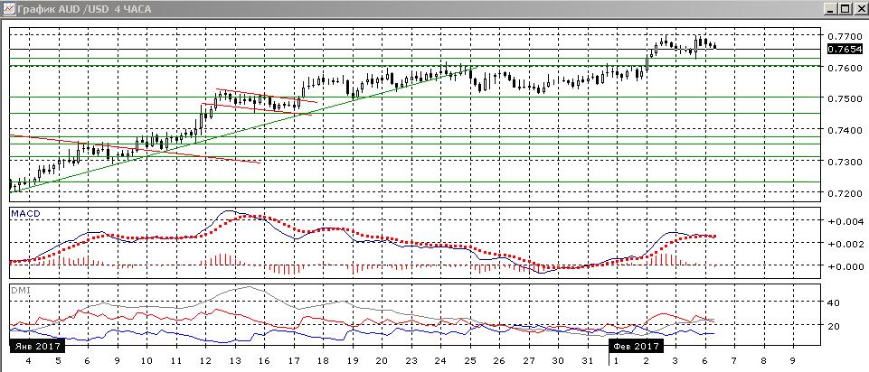 На четырёхчасовом графике у 0,7700 возможно образование двойной вершины. В этом масштабе также образовалось медвежье расхождение максимумов пары и гистограммы MACD. Последовательность роста относительных максимумов и минимумов пары сохраняется. Фигура двойной вершины появится при преодолении промежуточного минимума на 0,7625. Пока разворота не видно, и тенденция кажется остаётся сильной. Но цель по росту на 0,7700 скорее достигнута — движение, равное ширине предыдущего канала между 0,7500 и 0,7600. На рост стоит рассчитывать при преодолении уровня 0,7700.