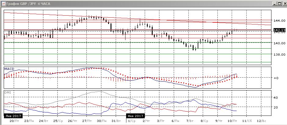На четырёхчасовом графике пара достигла уровня сопротивления 142,25. Пара перешла к росту, от 139,00 относительные максимумы и минимумы последовательно растут, пара преодолела сопротивление на 141,50, по индикаторам направленного движения тенденцией стал рост: DM+ выше DM-, гистограмма MACD растёт в положительной области, линия ADX имеет положительный наклон. Рост, скорее, продолжится с целью на линии нисходящего тренда.
