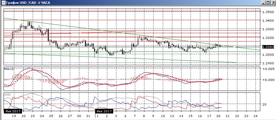 На четырёхчасовом графике похожая картина: около 1,3000 двойное дно, 14 и 16 февраля. Пара находится около нисходящей линии тренда. Также пара остаётся ниже уровня 1,3100 (это было сопротивление 13, 14 и 15 февраля и поддержка 9 февраля). Скорее, стоит действовать в направлении выхода пары за границы 1,3000-1,3100.