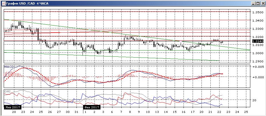 На четырёхчасовом графике пара тестирует уровень сопротивления 1,3150 после того, как преодолела линию тренда. Относительный максимумы и минимумы от 1,30 последовательно растут. По ADX тенденция роста стала сильной — DM+ существенно выше DM-, ADX на повышенном уровне и растёт. Ближайшей целью роста видится 1,3200 — уровень, который тестировался 7 и 8 февраля, и ближайший «круглый» уровень.