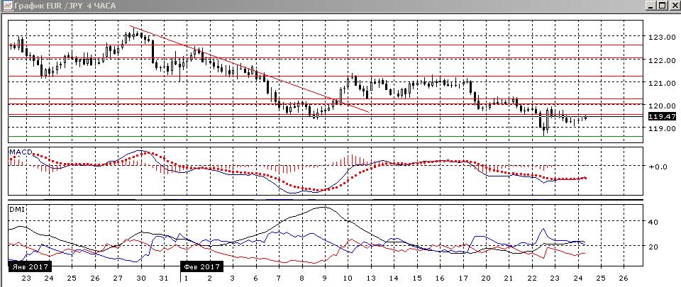 На дневном графике произошёл пробой уровня поддержки 119,55, около минимума начала февраля. Несмотря на то, что 22 февраля образовался «молот», роста в далее не было, и уровень 199,55 выступает теперь сопротивлением для пары. Пока пара ниже 119,55 снижение видится предпочтительным, иначе может возникнуть ситуация ложного пробоя уровня. По ADX тенденция снижения усилилась: DM+ существенно выше DM-, линия ADX существенно выросла. При достижении нового минимума, однако, образовалось и бычье расхождение минимума пары и гистограммы MACD что увеличивает вероятность роста. Вместе с образовавшимся ранее «молотом», снижение выглядит сейчас рискованным.