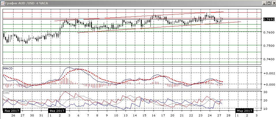 На четырёхчасовом графике горизонтальный канал 0,7600-0,7700 можно подкорректировать до восходящего. При таком рассмотрении, пара 24 февраля достигла нижней границы этого канала, и от неё происходит отскок вверх. В рамках движения в восходящем канале предпочтителен рост, и целью видится уровень 0,7745, около максимума 23 февраля. По индикаторам направленного движения в этом масштабе флэт.