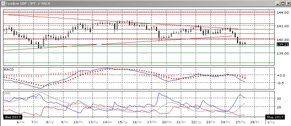 На четырёхчасовом графике пара быстро преодолела уровень поддержки на 140,00 (проявился 8 и 17 февраля), и ближайшей целью видится тестирование уровня 139,00 — уровень, более важный в более крупном масштабе. По ADX тенденция снижения стала сильной: превышение DM- над DM+ очень большое, ADX растёт. Снижение гистограммы MACD в отрицательной области и отрицательный наклон линии MACD подтверждают тенденци. Пока не видно признаков разворота — отскок от 139,00 был очень слабым, и скорее снижение пока будет продолжаться. В любом случае, идти против сильного пробоя слишком рискованно.