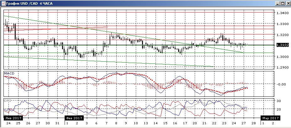 На четырёхчасовом графике пара продолжает тестировать уровень 1,3100 — здесь образовались уже ряд «теней» ниже 1,3100, но тело свечей остаётся выше этого уровня. Так как пара достигала новых минимумов, и уровень сохраняет устойчивость, пока сохраняется некоторая неопределённость (это и видно по того, что происходят колебания около одной точки). Насыщенный календарь этой недели даёт много возможностей выхода от 1,3100 на основе реакции на новости. Ближайшим признаком возобновления роста был бы переход пары выше 1,3150.