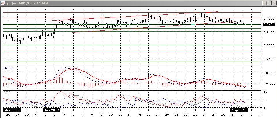 На четырёхчасовом графике пара ниже границы восходящего канала с начала февраля, тестируется уровень 0,7655. По индикаторам направленного движения флэт. Учитывая постепенное снижение пары с 23 февраля, предпочтительным видится снижение до поддержки на 0,7625. Энергии для преодоления сильных уровней сопротивления/поддержки сейчас не видно, скорее пару выведут из флэта не технические факторы.