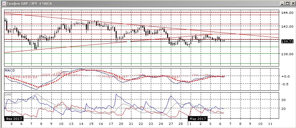 На четырёхчасовом графике происходит рост от 139,00, но это движение остаётся в пределах коррекционного к снижению и, кажется, завершается — относительные максимумы с 1 марта снижаются, и при преодолении текущего уровня (около 139,70) пару до 139,00 ничего не поддерживает. По ADX тенденция снижения сохраняется — DM- выше DM+.