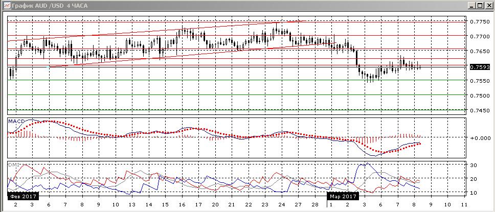 На четырёхчасовом графике пара вернулась ниже 0,7600 после быстро завершившейся попытки прорыва выше 7 марта. Учитывая, что пара сейчас неоднократно тестировала уровень 0,7600, и остаётся ниже него, значимость его как уровня сопротивления возрастает. Кроме того, это гасит импульс роста от 0,7550. Поэтому переход к снижению видится более предпочтительным с целью на 0,7550. Ключевым уровнем сопротивления, до преодоления которого текущий рост пары от 0,7550 видится только коррекцией к снижению, представляется 0,7655 (уровень поддержки второй половины февраля).