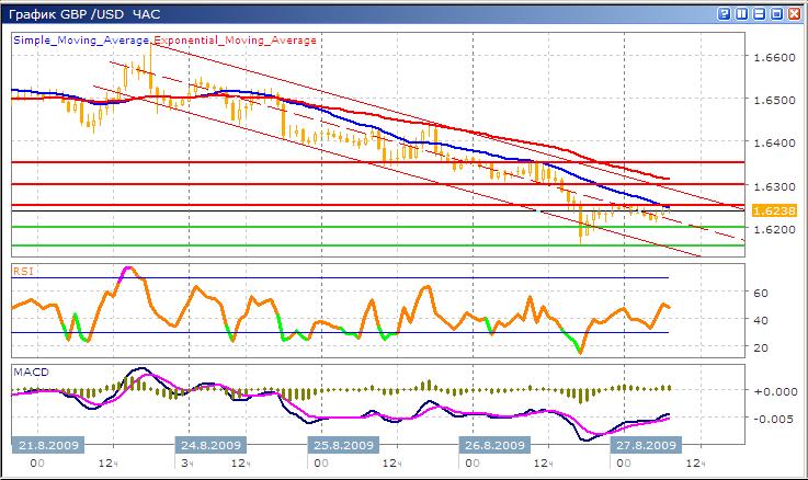 В ходе вчерашних торгов пара британский фунт\доллар США показала полуторамесячный минимум, достигнув отметки 1.6156. Последовавший за тем отскок от этого уровня привел пару обратно в нисходящий канал, в котором она двигается с 21 августа. Уровень 1.6250 оказался не преодоленным и с начала сегодняшних торгов пара торгуется с понижением. Средние скользящие показывают уверенный тренд вниз. Индикаторы MACD и RSI позволяют говорить о краткосрочном движении вверх, которое может встретить сопротивление на 1.6250 и от ЕМА21, которая спускается к этому уровню. Если удастся преодолеть это сопротивление, то затем паре прямая дорога к 1.6300. Движение вниз будет нацелено на преодоление уровня 1.6200 и, если силы продавцов окажутся существенны, то после его преодоления возможна попытка повторения вчерашнего результата — движение в район 1.6150.