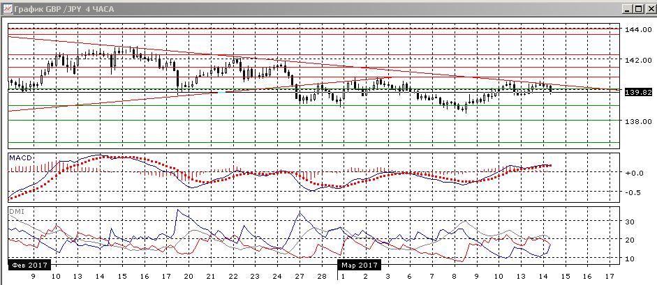 На четырёхчасовом графике ситуация более нейтральная: видно два определившихся уровня — сопротивление на 140,80 и поддержка на 139,00. Пара снизилась после приближения к верхней границы (там образовалась небольшая двойная вершина). В рамках движения в канале предпочтительным видится снижение к нижней границе 139,00 (откат от линии долгосрочного тренда также делает это более вероятным).
