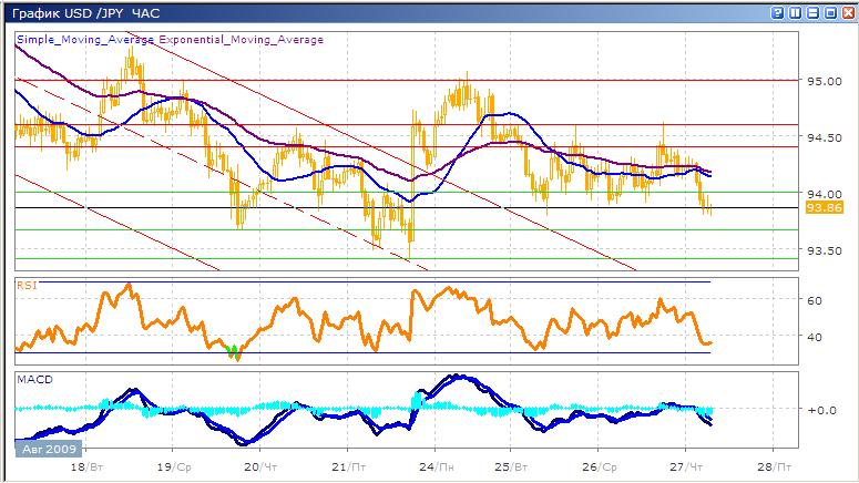 Протестировав в понедельник уровень 95.00 пара откатилась вниз и вторник и среду торговалась в узком диапазоне 93.90-94.60. С начала сегодняшних торгов пара снова пытается выйти из бокового канала и закрепиться ниже уровня 94.00, что на данный момент ей пока удается. Если движение вниз получит сильный импульс и выйдет из канала, то следующую поддержку пара может получить на уровне 93.40 (сессионный минимум 21 августа). Средние скользящие, несмотря на двухдневную консолидацию, направлены вниз. Индикаторы MACD и RSI также говорят в пользу нисходящего движения. Движение вверх на уровне 94.20 встретит сопротивление от средних скользящих ЕМА21 и ЕМА55, которые сейчас находятся очень близко к друг другу. Дальнейшее движение вверх встретит сопротивление на верхней границе двухдневного бокового канала 94.60.