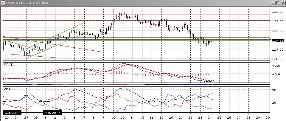 На четырёхчасовом графике происходит отскок от 119,50, который сейчас замедляется перед 120,00. Пока последовательность снижения относительных минимумов и максимумов пары не нарушена. По ADX тенденция снижения сильная — превышение DM- над DM+ большое при высоком уровне ADX, и он продолжает расти. Пока последовательность снижения относительных минимумов не нарушена, продолжение снижения видится предпочтительным даже несмотря на образование бычьего расхождения минимумов пары и гистограммы MACD. Уровень 119,50, скорее, снова будет тестироваться.