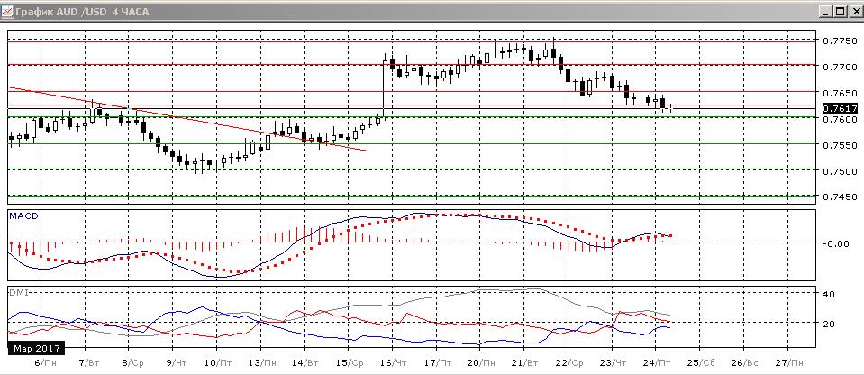 На четырёхчасовом графике продолжается последовательное снижение. Уровень 0,7650 после преодоления его 23 марта выступил уже сопротивлением при отскоке от 0,7625. Сейчас пара ниже и этого уровня сопротивления. При этом темп снижения замедляется — образовалось бычье расхождение минимумов пары и гистограммы MACD, что может привести к отскоку от 0,7600 (так как рядом сильный уровень поддержки). О развороте в краткосрочной перспективе можно будет говорить, если пара преодолеет 0,7650. Пока рассчитывать на дальнейшее снижение кажется излишне рискованным до преодоления 0,7650, и идти против тренда тоже не стоит. Лучше подождать развития ситуации.