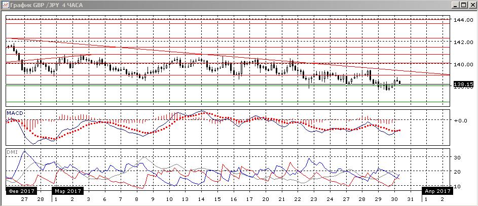 На четырёхчасовом графике пара преодолела уровень поддержки на 138,00, около которого 22 и 27 был двойной минимум. В целом последовательность снижения относительных максимумов и минимумов сохраняется. Сейчас пара почти достигла уровень 138,00 и скорее уровень будет преодолён. Пока пара ниже линии тренда, снижение видится предпочтительным.