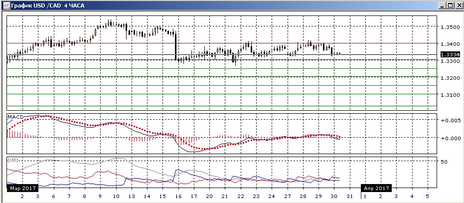 На четырёхчасовом графике ситуация не изменилась, пара остаётся в диапазоне 1,3300-1,3400. Сейчас происходит снижение пары от 1,3400, и целью движения видится уровень нижней границы канала на 1,3300. Более значительное движение будет в сторону выхода пары из канала.
