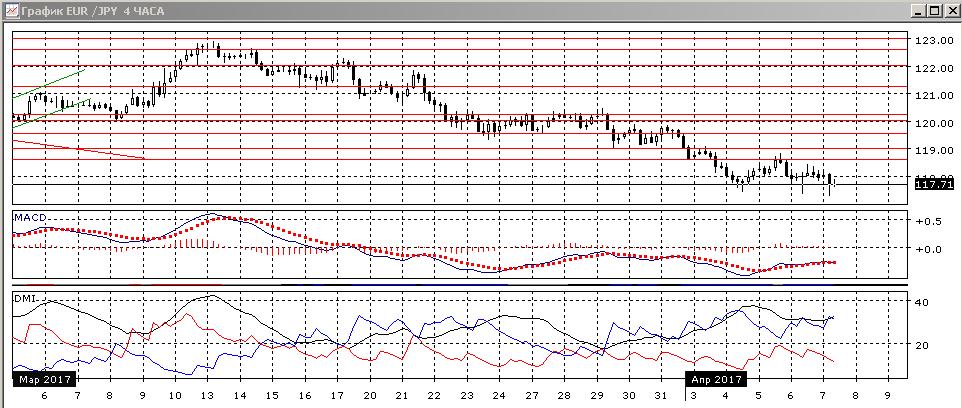 На четырёхчасовом графике возможно образование базы. Уровень 200-дневной средней прокалывался только краткосрочно, пока пара восстанавливалась выше. Образовалось бычье расхождение минимумов пары и гистограммы MACD. Это повышает вероятность отскока вверх. Тенденция снижения , однако, не изменилась, и относительные максимумы и минимумы пары снижаются, по ADX снижение является сильной тенденцией. До закрепления ниже 117,70 рассчитывать на продолжение снижения рано.