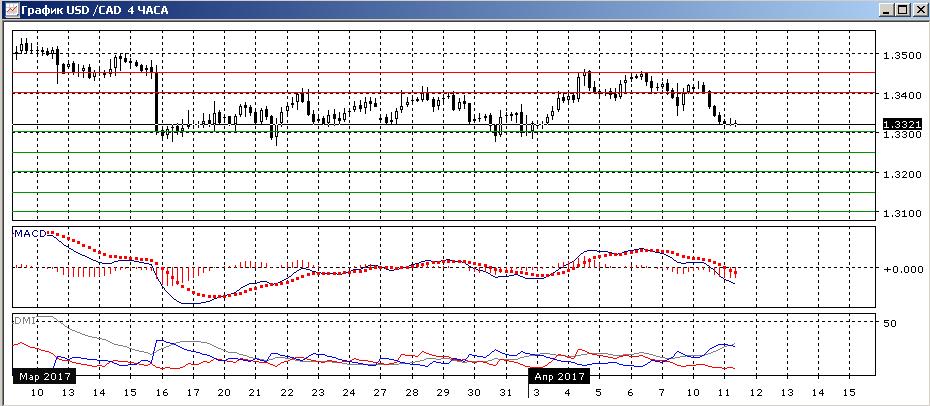На четырёхчасовом графике в целом сохраняется движение в диапазоне, пара приближается к нижней границе 1,3300. С приближением к цели снижения (ниже 1,3300) более предпочтительным видится рост до верхней границы консолидации 1,3400. По индикаторам направленного движения тенденцией является снижение (DM- выше DM+, гистограмма MACD снижается в отрицательной области, линия MACD имеет отрицательный наклон.) Относительные максимумы и минимумы пары от 1,3450 последовательно снижаются. Однако, до закрепления ниже 1,3300 рассчитывать на продолжение снижения рано.
