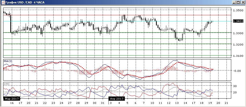 На четырёхчасовом графике видно, что рост у 1,3400 приостановился — пара тестирует этот уровень, но преодоления его не происходит. Как и в более крупном масштабе, скорее дальнейшая перспектива будет определяться тем, будет ли преодолён уровень 1,3400 в ближайшее время, или откат не будет встречать сильной поддержки до 1,3300.