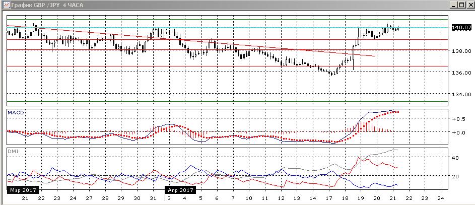 На дневном графике после преодоления долгосрочной линии тренда находится во «флаге» 139-140. Более вероятно, что выход из «флага» будет вверх, так как это фигура продолжения. То, что пара закрепилась выше линии тренда и то, что отката от 140,00 не было несмотря на образование «падающей звезды». По индикаторам направленного движения тенденцией остаётся рост: DM+ выше DM-, гистограмма MACD растёт на положительной территории. Впереди ряд обоснованных уровней сопротивления, начиная от 140,80 и более сильный — у 145,00.