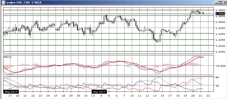 На четырёхчасовом графике пара находится в консолидации в границах 1,3450-1,3500 после значительно роста от уровня 1,3250. Поддержкой является уровень сопротивления 4 и 6 апреля на 1,3450. Так как консолидация идёт выше преодолённого уровня сопротивления, более вероятно, что выход из диапазона будет вверх. Однако стоит ориентироваться на движение в сторону выхода из диапазона 1,3400-1,3450.