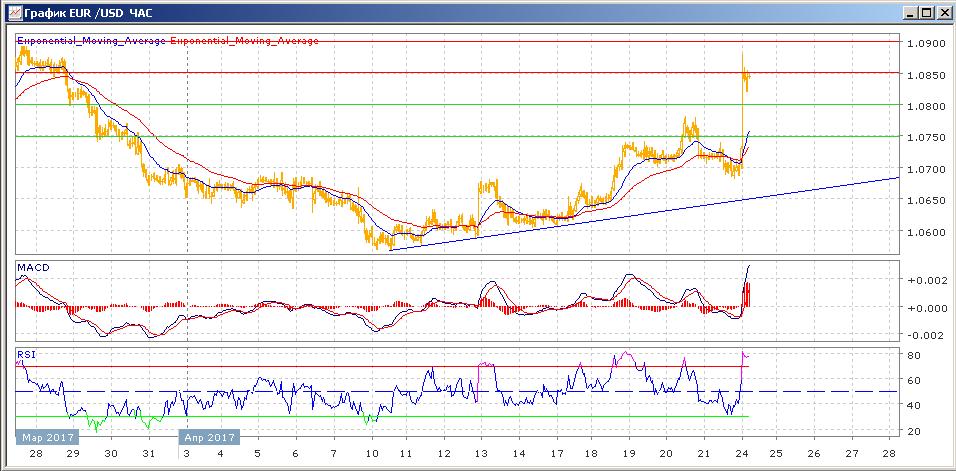 пара продолжает начавшийся 10 апреля рост. В четверг пара закрылась со слабым ростом на 1.0717, сделав в середине торги попытку роста и закрепления выше 1.0750. в пятницу пара был склонна к снижению и лишь а последний час торгов пара выросла, закрывшись на 1.0731. сегодняшние торги открылись сильным гэпом вверх на фоне выборов во Франции, пара на данный момент торгуется на 1.0850. Средние скользящие ЕМА21 и ЕМА55 направлены вверх и растут. Индикаторы MACD и RSI с вышли выше своих центральных линий, RSI зашел в зону перекупленности.