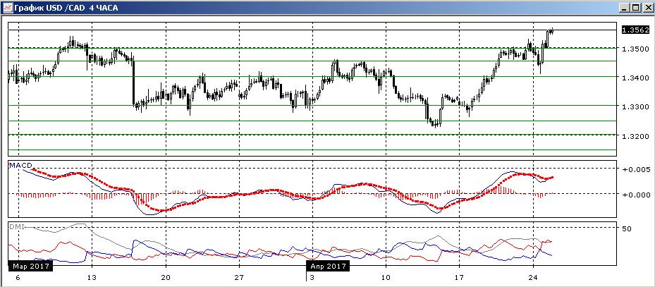 На четырёхчасовом графике образовалось медвежье расхождение максимумов пары и гистограммы MACD, что увеличивает вероятность отката. Так как это происходит относительного недалеко от сильного сопротивления на 1,3600, этот уровень сопротивления укрепляется. В целом рост пары с середины апреля сохраняется, что делает более предпочтительным продолжение роста, но с близкой целью на 1,3600.
