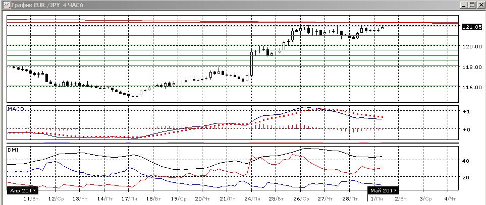 На четырёхчасовом графике около 122,00 было уже три отката с 26 апреля. Образовалось медвежье расхождение максимумов пары и гистограммы MACD, что увеличивает вероятность снижения. Последовательность роста относительных минимумов пары была нарушена. Вместе с тем, по индикаторам направленного движения происходит коррекция, но тенденция остаётся сильной: DM+ устойчиво значительно выше DM-, коррекция видна по отрицательному наклону линии MACD и нахождением гистограммы MACD в отрицательной зоне. Дальнейшая перспектива, скорее, определится тем, преодолеет ли пара уровень 122 — в этом случае стоит ожидать дальнейшего существенного роста.