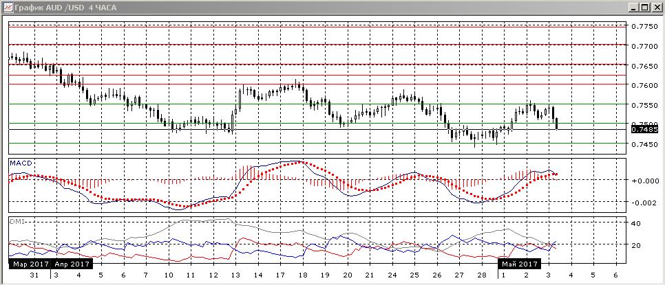 На четырёхчасовом графике пара снижается от 0,7450, около этого уровня образовалась двойная вершина и сейчас пара преодолела уровень промежуточного минимума. Это подтверждает разворот и делает более предпочтительным продолжение снижения пары. По индикаторам направленного движения пара переходит к снижению — гистограмма MACD перешла на отрицательную территорию, DM- теперь выше DM+.