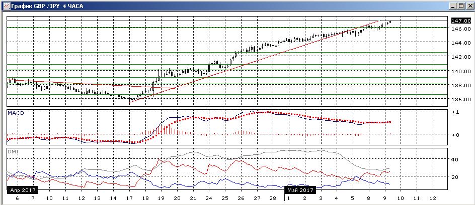На дневном графике в целом ситуация не изменилась — последовательный рост пары продолжается. Пара преодолела уровень сопротивления 145,00 и приближается к максимуму декабря на 148,50. По индикаторам направленного движения рост остаётся сильной тенденцией: DM+ значительно выше DM- при росте ADX, гистограмма MACD на положительной территории, линия MACD имеет положительный наклон. Скорее, пока рост будет продолжаться.