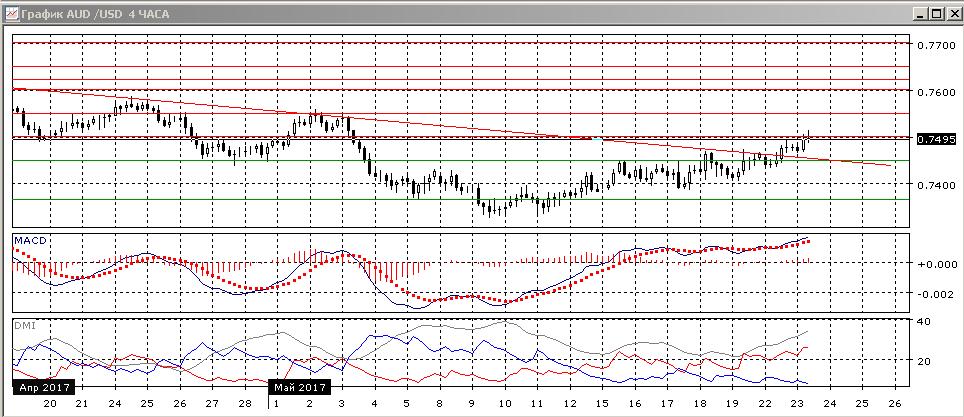 На дневном графике пара преодолела уровень сопротивления на 0,7450, около минимумов конца апреля. Также пара преодолела нисходящую линию тренда, если строить её с середины марта в нескольких вариантах. , Показывает, что рост имеет сейчас существенную поддержку. Однако пара достигла ключевого сопротивления на 0,7500, и он пока ограничивает пару. При закрытии выше, скорее будет движение к следующему «круглому» уровню 0,7600. По индикаторам направленного движения тенденция меняется: гистограмма MACD растёт в положительной зоне, линия MACD получила положительный наклон, превышения DM- над DM+ уже нет.