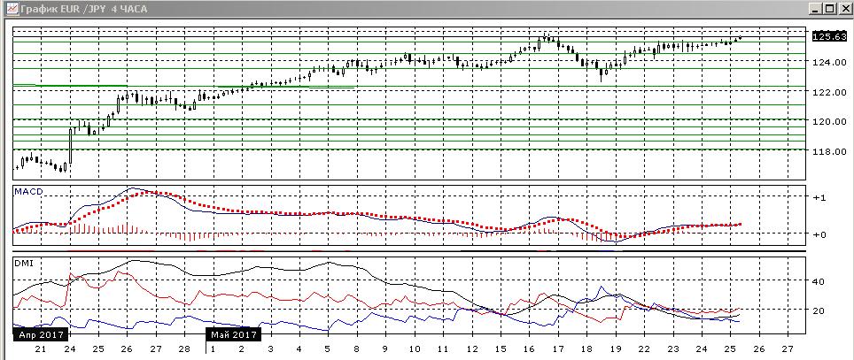 На четырёхчасовом графике после длительного тестирования уровня 125,30 пара преодолела его, и сейчас этот уровень можно рассматривать ближайшей поддержкой. Исходя из размера консолидации в 80 пунктов, ближайшей целью роста может быть 126,10, что лишь немного выше максимума 125,85, достигнутого 16 мая. Последовательность роста относительных максимумов и минимумов пары сейчас сохраняется. Пока пара выше 125,30, продолжение роста видится предпочтительным.